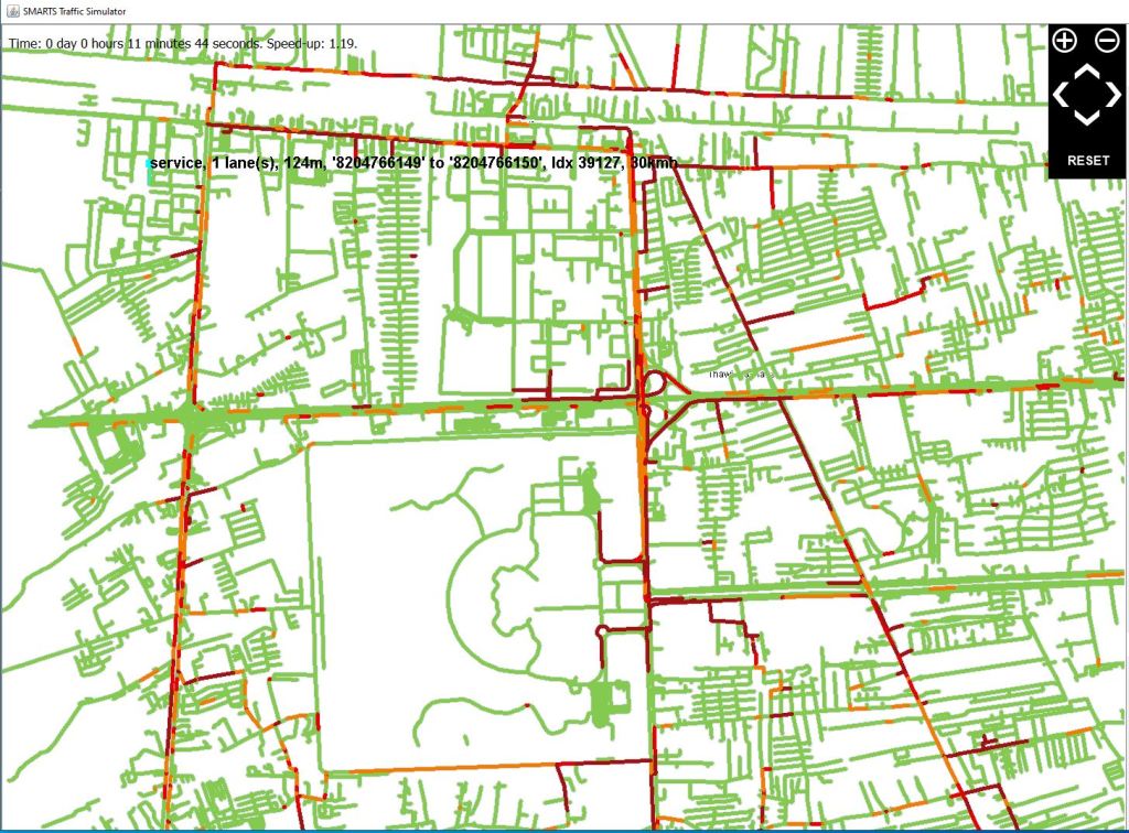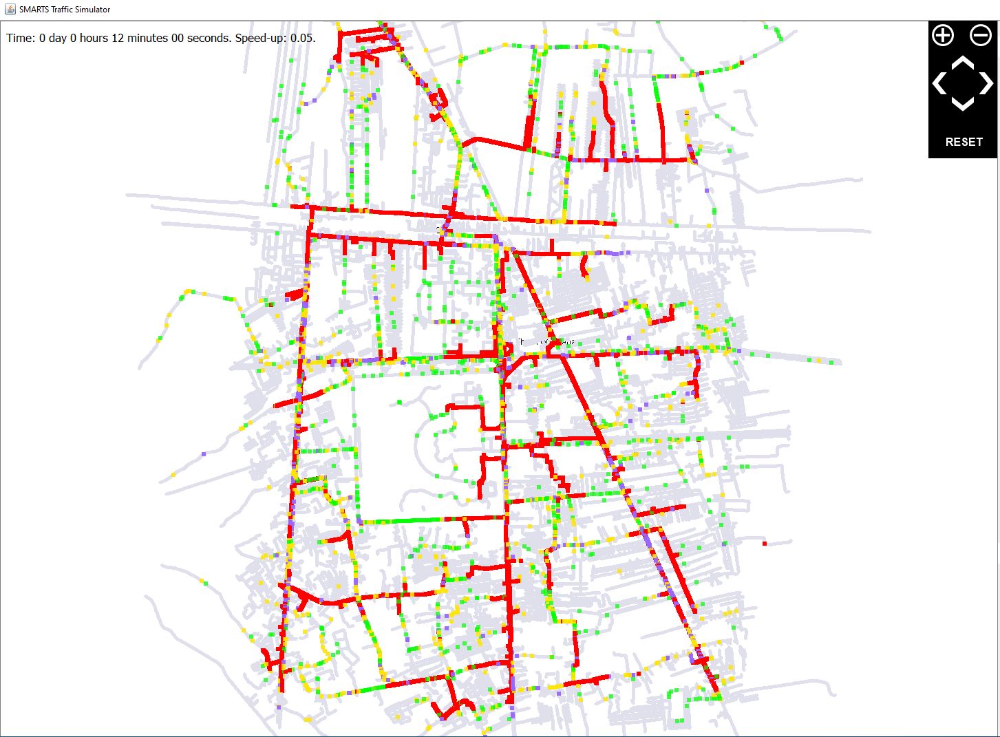 However, the agents prefer the park and the palace instead of the city commute. Below is a screenshot example after 11 minutes. After 1 hour, the agents continued to converge on the already congested roads.