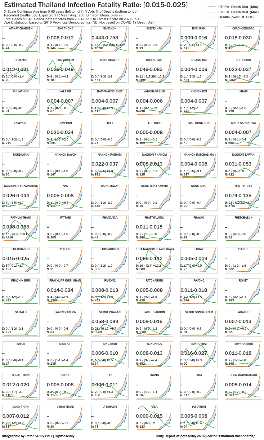 For Infections by Province in Thailand, this page’s method can help to replicate the procedure. This remains a “reasoned strategy” to model infections within each of Thailand’s provinces and under the condition to statistically estimate Thailand’s missing data required by Imperial College London’s projection model using IFR.